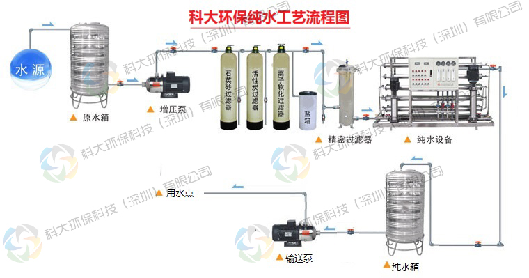 源水箱→源水增壓泵→多介質過濾器→活性碳過濾器→陽樹脂軟化器→精密過濾器→一級RO反滲透純水系統→二級RO反滲透純水系統→水氣混合器→臭氧殺菌機→不銹鋼純水罐→恒壓輸送系統→用水點