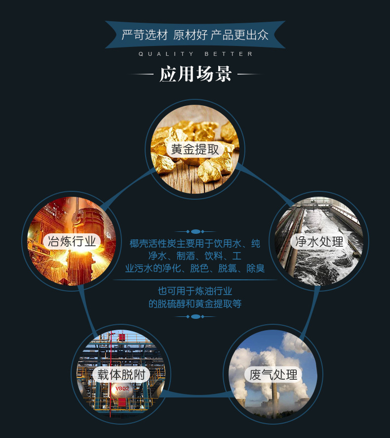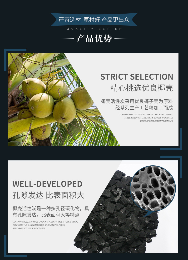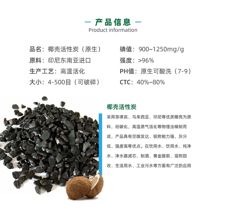 椰殼活性炭,采用菲律賓、馬來西亞、印尼等優(yōu)質(zhì)椰子殼為原料,經(jīng)碳化、高溫蒸氣活化等系列物理法生產(chǎn)工藝精加工而成。椰殼活性炭外觀為黑色,顆粒狀,具有孔隙發(fā)達、吸附性能好、強度高、易再生、經(jīng)濟耐用等優(yōu)點,但是因為椰殼產(chǎn)地等問題,價格高于常規(guī)木質(zhì)活性炭。